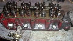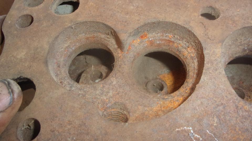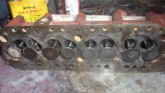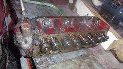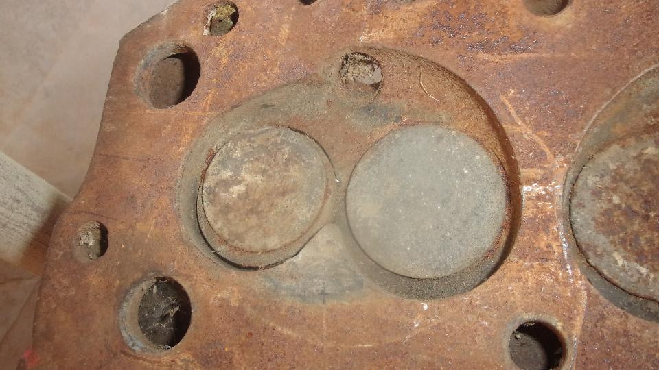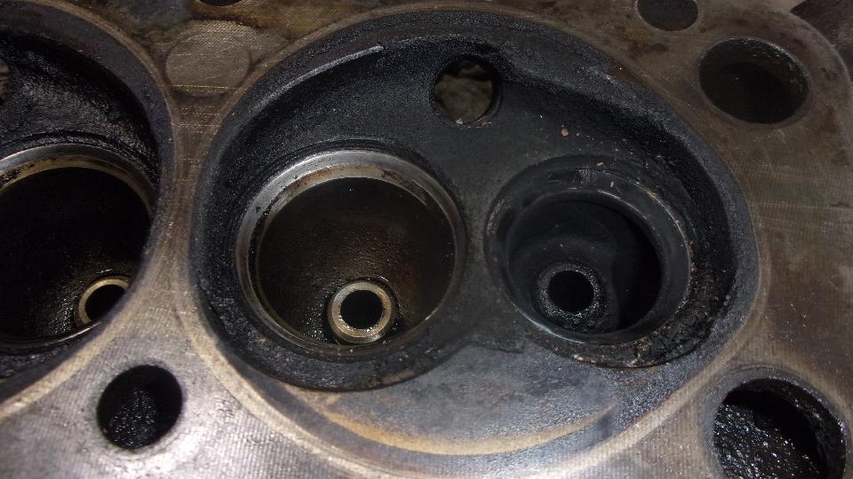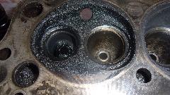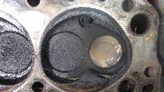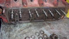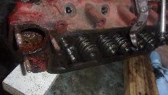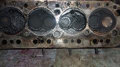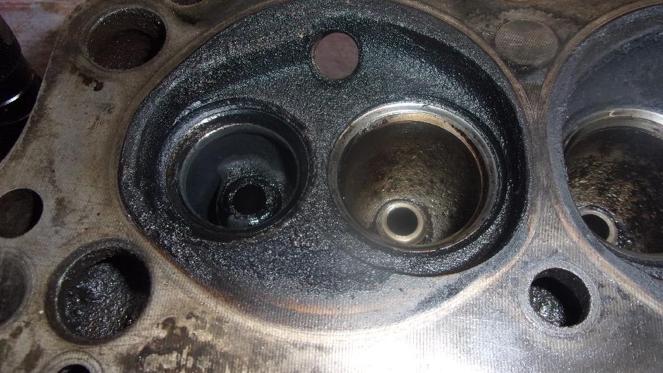 Stu's big valve spring compressor works very well, so not long to remove all of the valve hardware (and do keep the valves in the right order). All of the intake valves are still slightly proud of the chamber ceiling surface, and the seat lands are not excessively wide, so I think a little touch-up of the seats and and lapping of the intake valves will be enough there. However, all of the exhaust valves are recessed below flush, and the seating surfaces in the head are almost as wide as the seat surfaces on the valve heads (way too wide on the seats). I recon this is beyond doing a 3-angle touch-up on the exhaust seats, so maybe time to replace the hardened steel valve seats (again). Just checking when this head was reconditioned, and the records say 5-years and 167,000 miles. Considering how hard this engine works, that's probably reasonable.