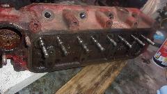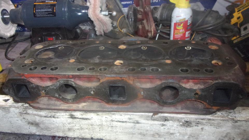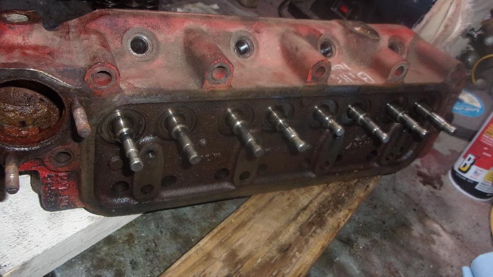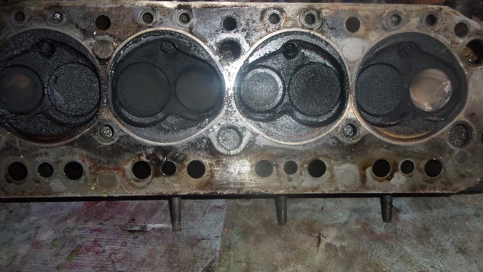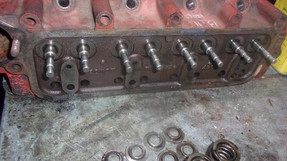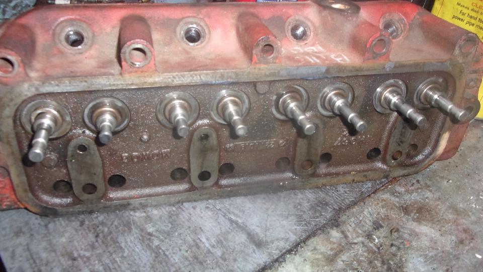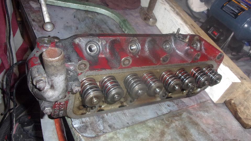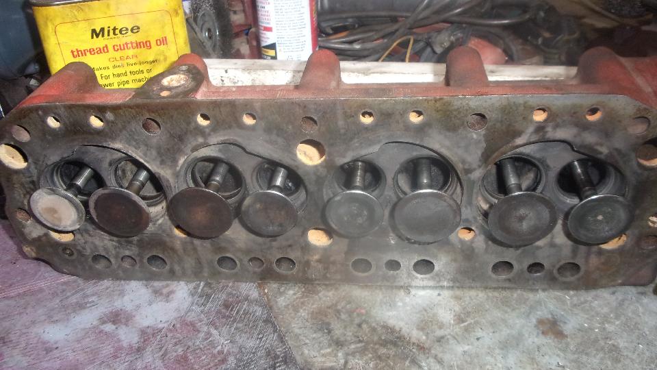 I set the head upside down and level, and filled the combustion chambers with water, and wait. After half an hour there was no leakage at all from any of the exhaust valves (which had been my experience in the past). No. 3 intake valve was leaking little, a steady drip into the port. I was expecting most of the intake valves to leak like that, but the rest of them didn't leak, which surprised me some. So now I'm confused. If the rings don't leak and the valves don't leak, why does it have low compression? Uh, time to test the compression tester gauge, maybe?