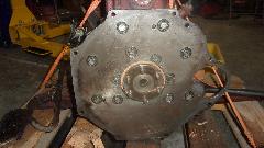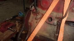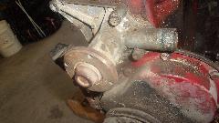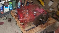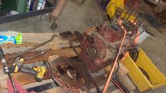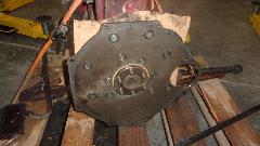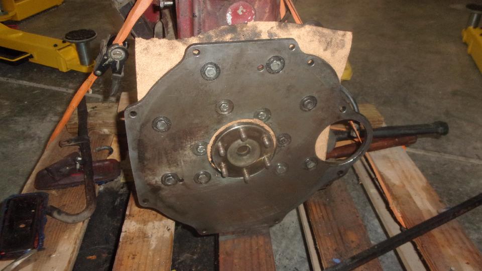 Thar she blows. We set it on a heavy duty roller table and removed the clutch, flywheel and low-starter engine back plate to be transferred to the loaner 1600 engine (previously high-starter). Good news, the clutch friction disc survived the harsh treatment of the past few days, good for continued service.