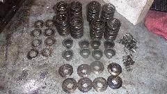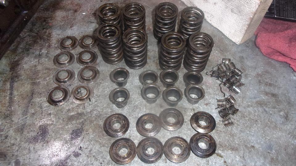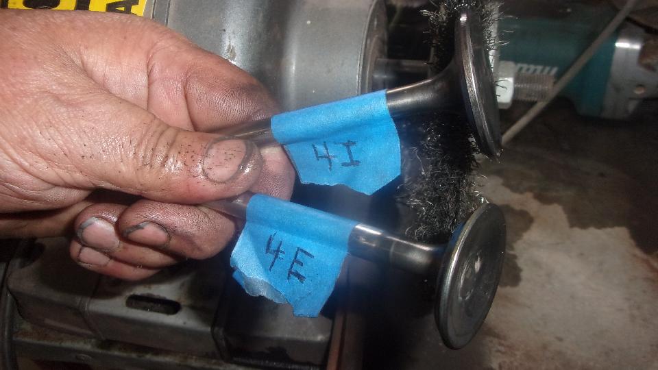 I had been wondering why my car was sitting outside this morning. Well, Stu was trying out his new pressure washer, and washed all the dirt and grease out the engine bay. Nice. -- Now that the work bench was clear I got busy disassembling the "new" engine head (because it had a couple leaky intake valves). Pop off all the valve springs and mating hardware to remove the valves, and give it equal billing by cleaning up te valves with the wire wheel.