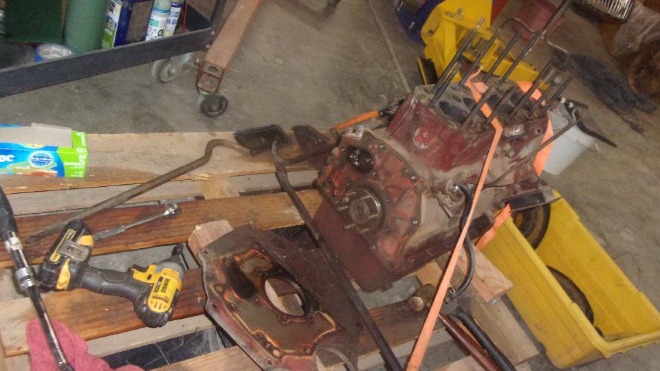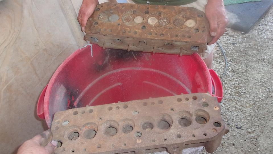 Pistons tops cleaned up easily with a Scotch-Brite abrasive wheel. Pistons and bores are 0.030-in oversize, clean, no ridge, no lateral wiggle for the pistons, so that looks good to go as is. All cam lobes smooth and shiny, no visible damage, but I want to measure cam lift for all eight lobes just to be sure. Can't find the pushrods and tappets, so need to order those parts new, and hope they will arrive in two or three days while we do the engine transplant. Not keen on the aluminum water pump (notorious for breaking the ear), but I have a spare iron body water pump in the Magic Trailer.