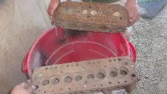 For reassembly I grabbed the spring cups from the old engine (left side of the third picture above). Notice this valve set still has the original valve guide splash shields (center of same picture). I am going to put this one back together with all original hardware, not to use any modern umbrella seals on the valve guides. So start with installation of the spring cups, followed by outer and inner springs with the splash shield, then spring cap and tiny O-ring seal on the valve stem, and the twin split lock cotters with the hair pin clip. All assembled, set the head upside down on a couple of boards, and fill the combustion chambers with water, up to and including a meniscus of water sightly above the gasket surface. I let it set there for an hour, and nothing leaked out through the ports, so score one for the good guy, we have no leaky valves.