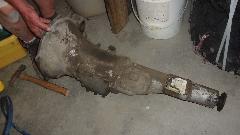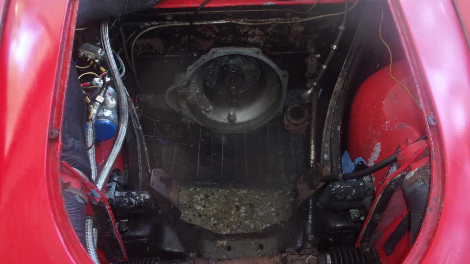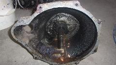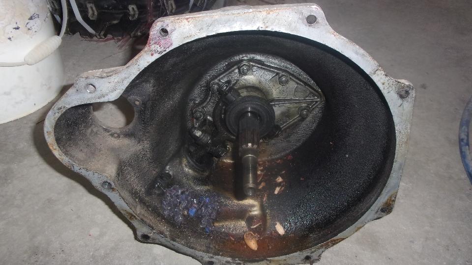 Meanwhile Stu was dismounting the gearbox from the "new" engine, revealing remains of a mouse nest in the bellhousing. Also remove the clutch pressure plate assembly and clutch disc and flywheel, and remove the high starter rear plate.