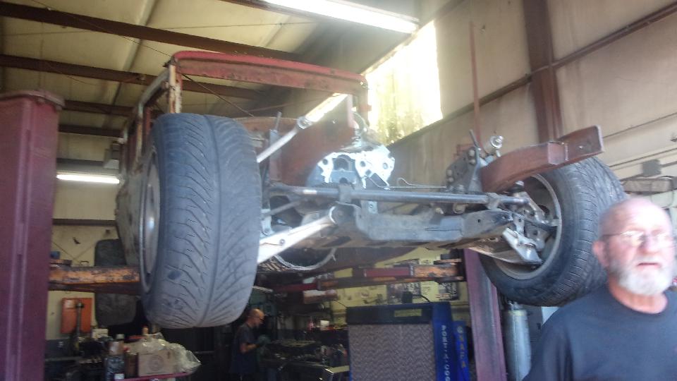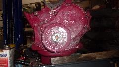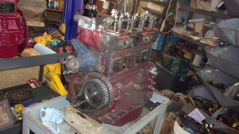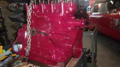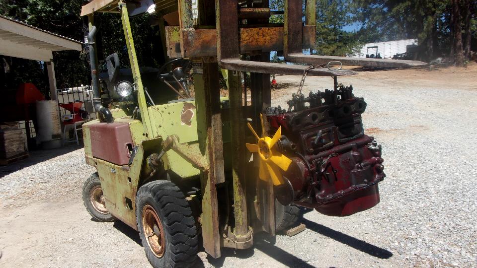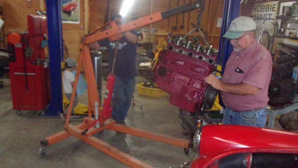 hanging on a fork lift truck. Plan-B is now to take the camshaft and tappets and pushrods (one year old) out of my old engine (don't mix them up) and put them in the new engine so I can get the car back on the road. That means additional labor to R&R the cam in the new engine (pity the fresh paint), plus having to disassemble some of the old engine immediately before getting the car back on the road. Then Stu was temporarily busy with something else, and I wasn't going to try wrenching on the old engine while it was still hanging on a chain, so that was it, the whole day shot for naught, go home.