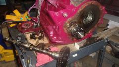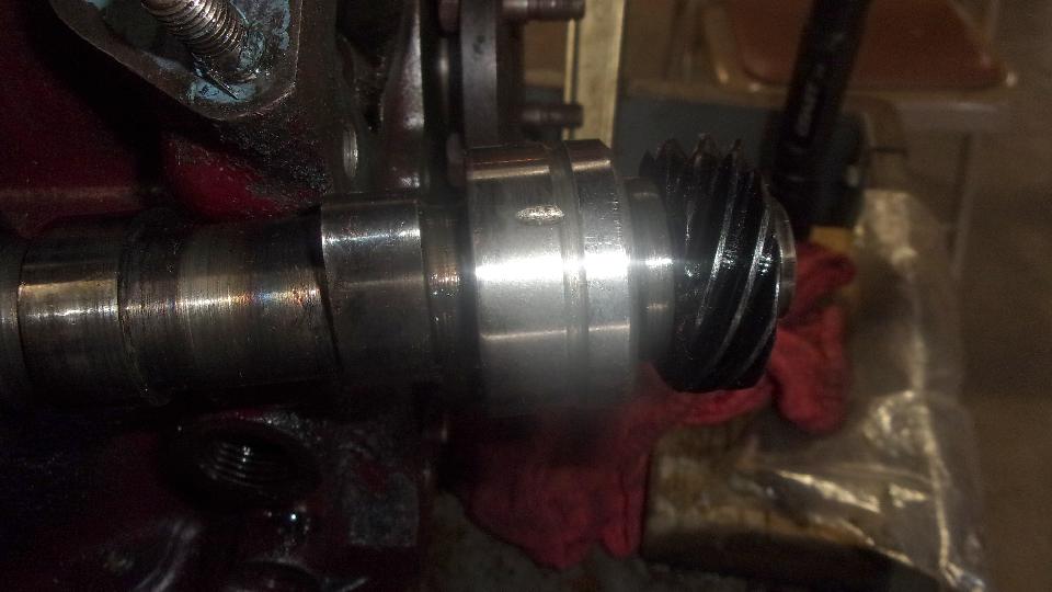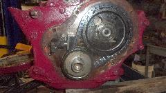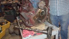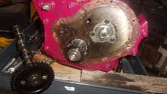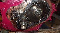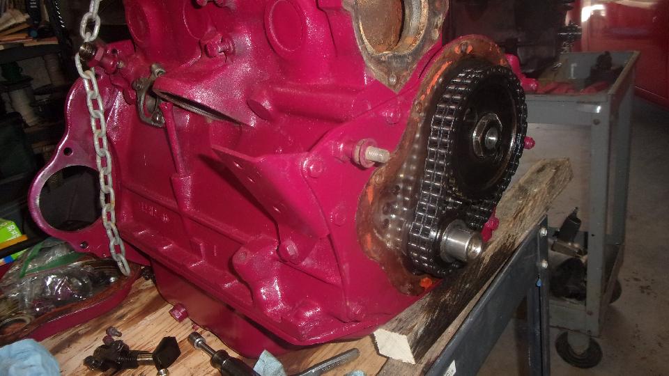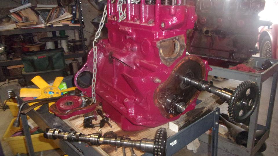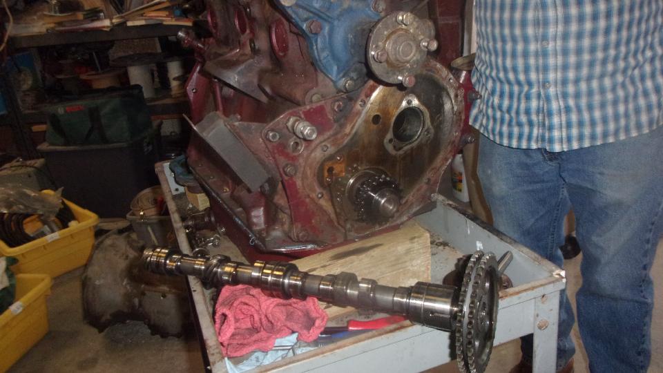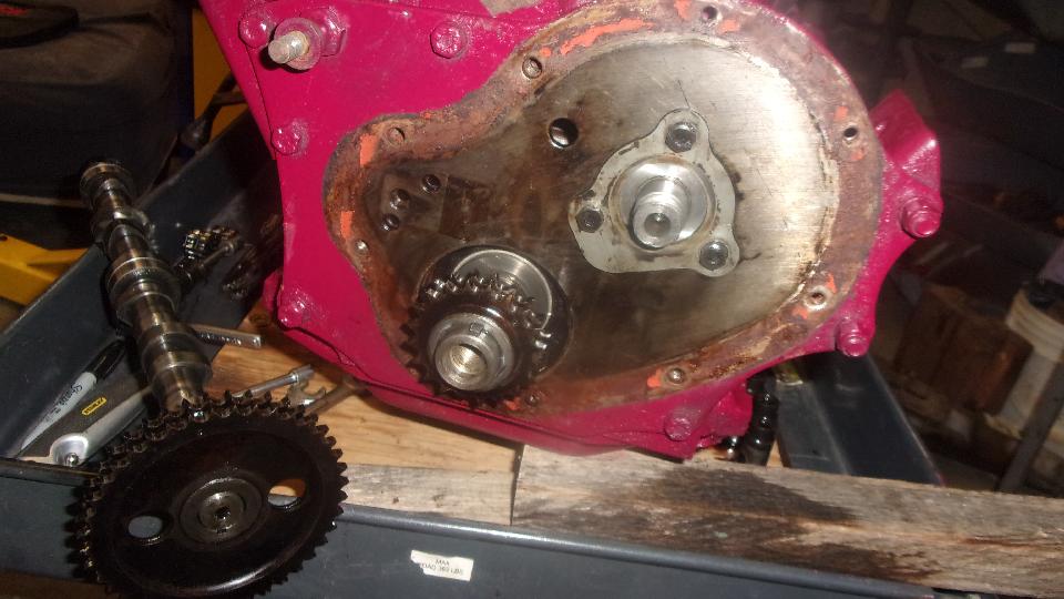 Time to swap camshafts between the two engines, because the new tappets and pushrods are not coming until next week. Remove crank pulley, cam nut and chain tensioner from both engines. Sprocket and chain off, and remove cam retaining plate. Remove distributor base clamp and base casting, and pull out the drive gear. Then the camshaft will pull out the front, no need to remove sump or oil pump or tachometer drive gear.