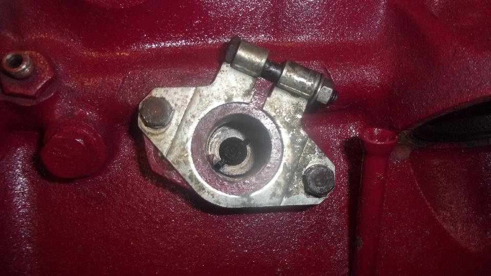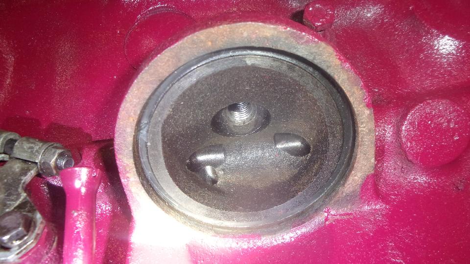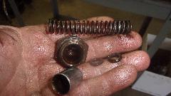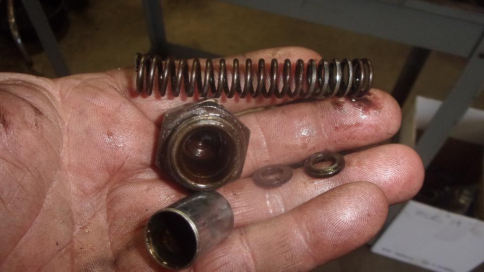 Finally back to the prime objective for the day, stripping my old engine down to bare block and bare head for machining. Remove engine mount brackets and front plate, tachometer drive and oil pressure relief valve parts. Note to self: spring is too short, so install a new spring exactly 3inches long with reassembly. The two 1/4-inch medium spring lock washers are packing pieces that will raise relief pressure 6-PSI for each one installed.