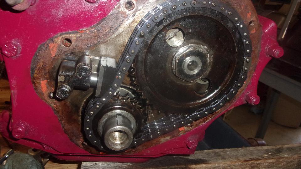 And there's what the timing chain looks like with the oil thrower on the crankshaft with flanged edge facing forward. The astute eye may notice the missing oil plug in the back end of the chain tensioner assembly. Yes I did get around to installing that plug and little lock tab, just not in this picture.