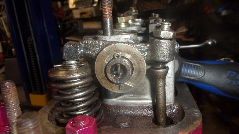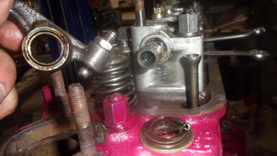 Back off rocker arm adjuster screws, and push rockers aside out of the way. Drop in the pushrods (in their respective order). Lever the valve spring down a bit to realign the rocker arms over the pushrods and valve stems. For front and rear positions the arms need to be removed, because they will not slide sideways. Grab the white nail polish and paint the timing marks (for convenience later).