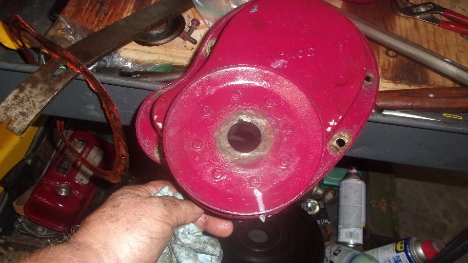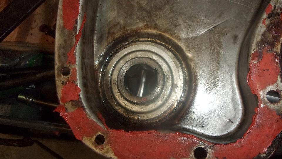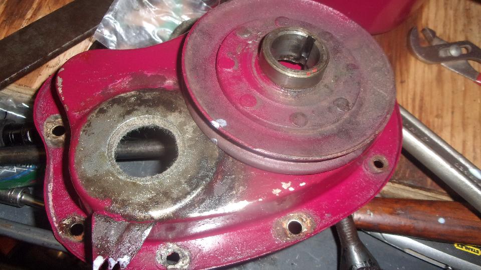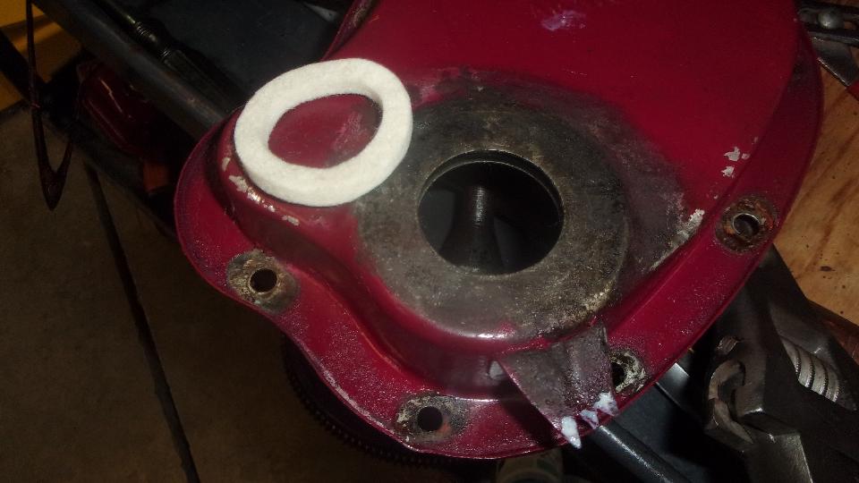 New felt seal an pulley in place, to be sure, before installing the cover. What it looks like on the inside, and what it looks like with the cup-shape oil thrower ring in place inside the cover.