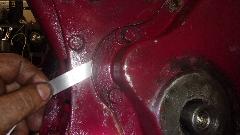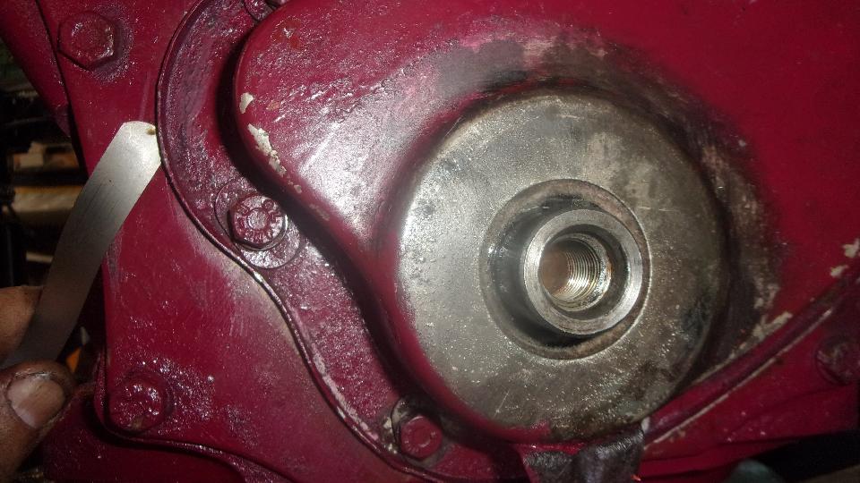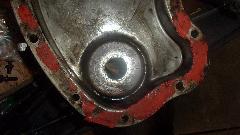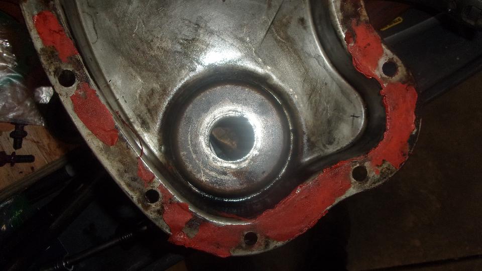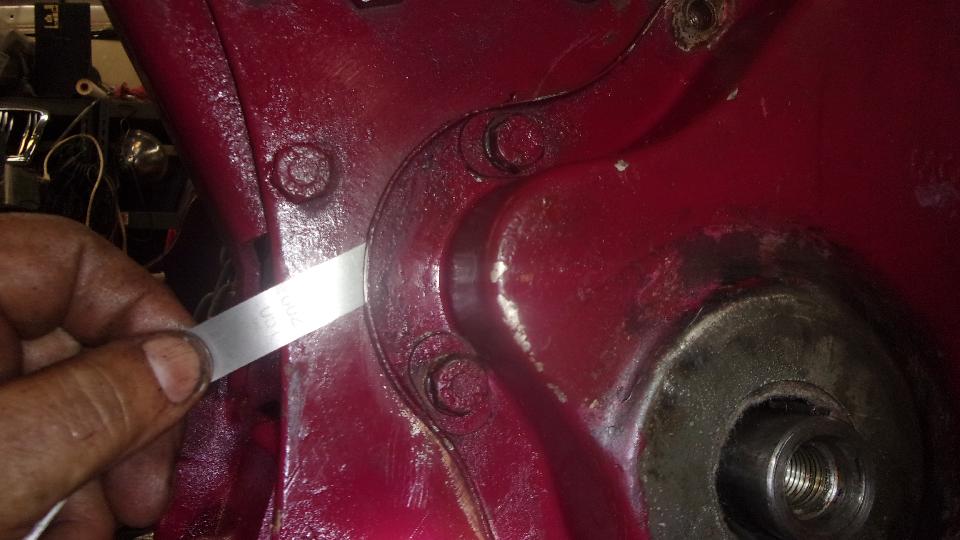 Then I tap down any protruding holes on the timing cover to make it fit flat. Bolt the bare timing cover in place with no gasket, and try to slip a 0.002-inch thick feeler gauge under the edges all around. Mark the flange anywhere the feeler might fit underneath. Then remove the cover, take to work bench, and hammer the flange down a bit where marked. Reinstall the cover and do the feeler gauge test again. This may take a few passes before you get it right, and the feeler will not fit under anywhere all around.