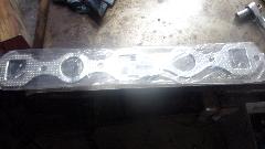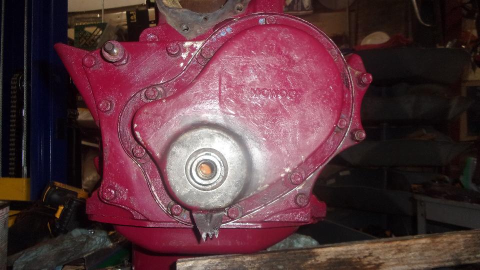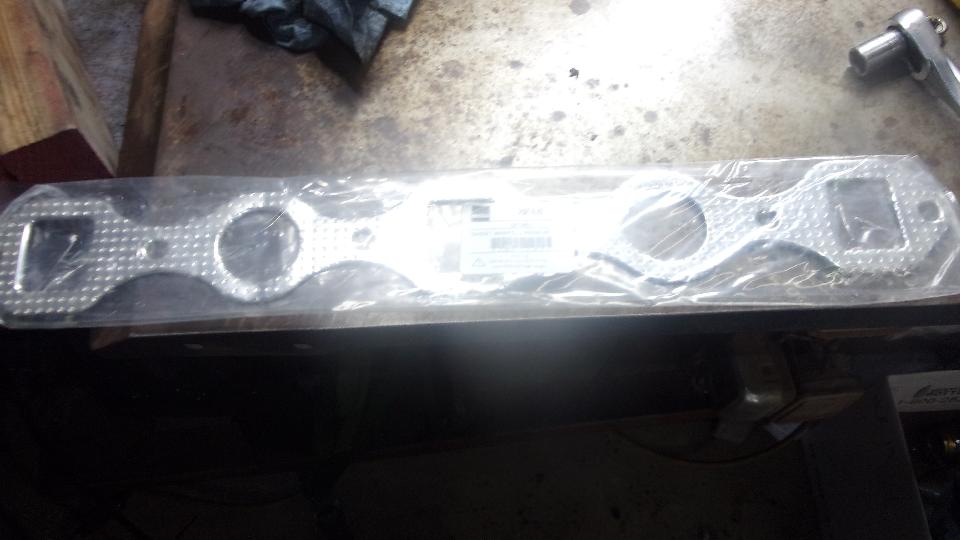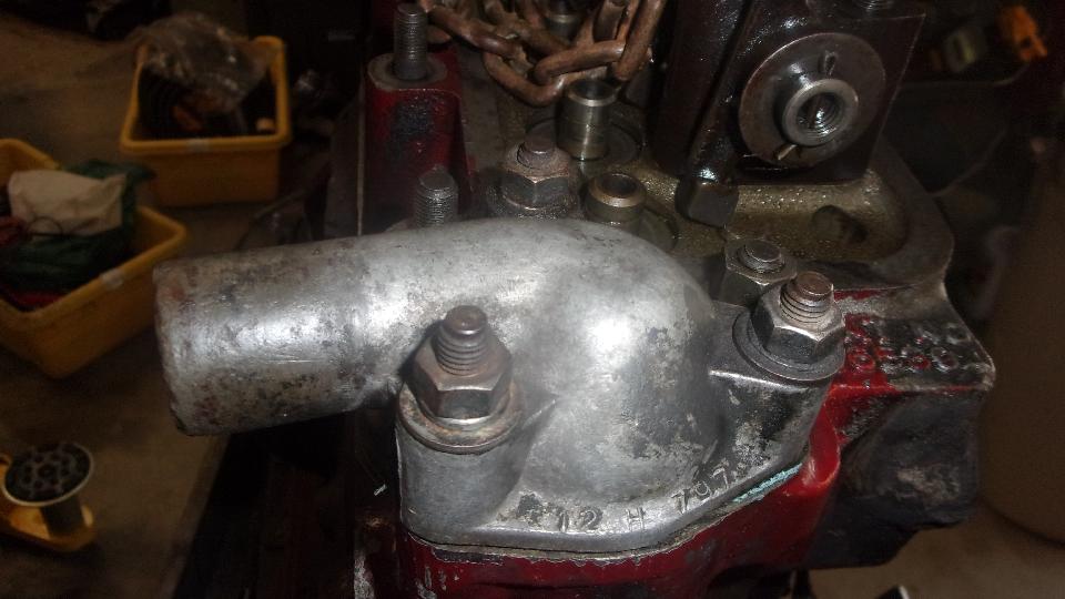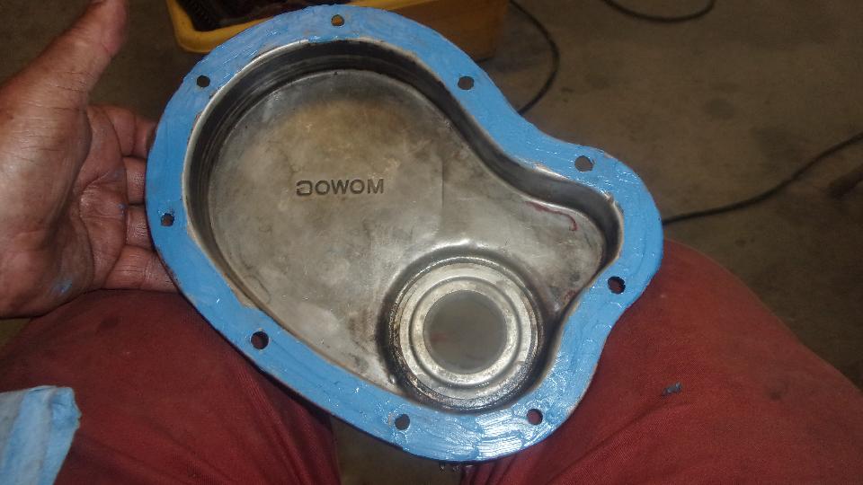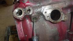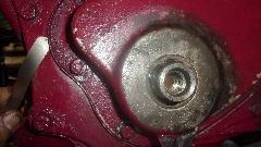 funny aluminum body water pump that I didn't like because many of them have broken). I do have another iron water pump in the trailer. This thick paper gasket was in such good condition that I didn't change it, just cleaned it up and installed it straight onto the new engine. Do remember to put thread sealant on the water pump bolts, because some of these threads go through into the water jacket.