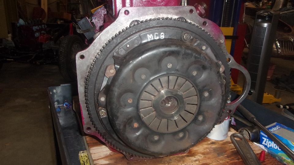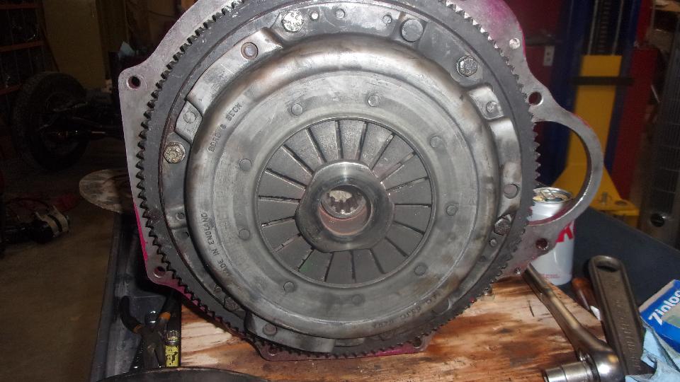 Spigot bushing checked okay, so leave that alone. Got the flywheel installed with new locktabs, and the old clutch assembly (which appeared to be in very good condition). But then a problem. The center thrust plate in the old MGB clutch was rattling around somewhat loose, like it might rattle all the time the engine is running (and maybe it was). Stu pulled out what looked like good used MGB pressure plate assembly with no wiggle at all on the center thrust plate. So we installed that one, after which it did have some wiggle, but not as much as the one we just removed. Note to self, order a new clutch assembly for spare parts.