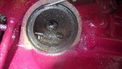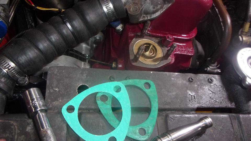Wait a minute, shut it down again. Coolant weeping out around a thermostat cover stud. I was a bit ticked, because these were the studs I couldn't remove from the head last week. Was it a weeping thread, or a leaking gasket? Removed cover for inspection, nothing obvious wrong. Installed another gasket, gluing it on the bottom this time, and a touch of the "blue stuff" around the base of the problem stud, then reassemble. That worked, no more leak anywhere in the cooling system, and the coolant recovery bottle was also working as the temperature came up.