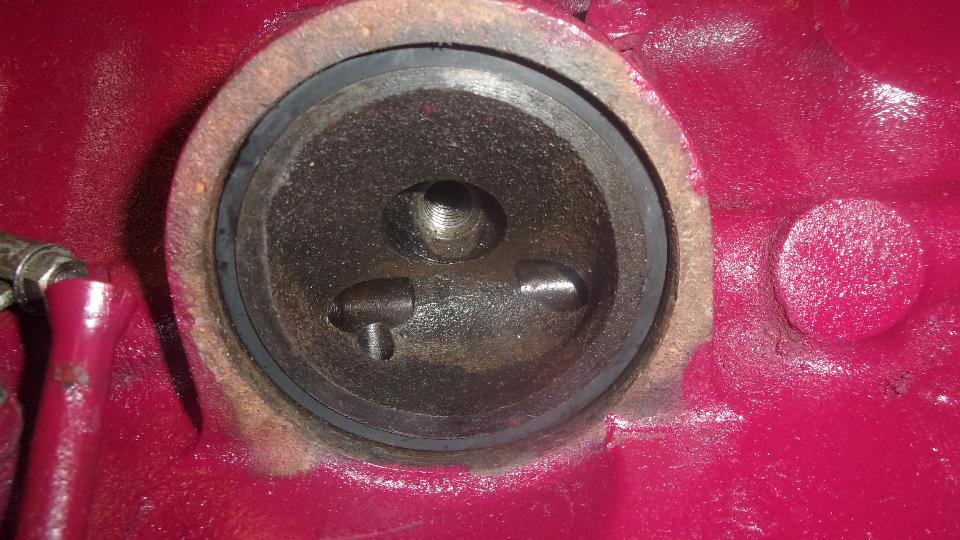 About to install the oil filter assembly, found double stacked seal rings. Oops. The first ring came out okay. Small screwdriver and big hammer to remove the second ring which was very hard and broke into many pieces, but finally got the gland cleaned out and installed a new seal.