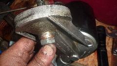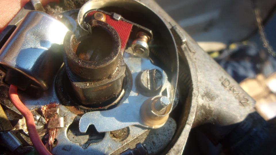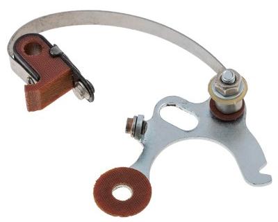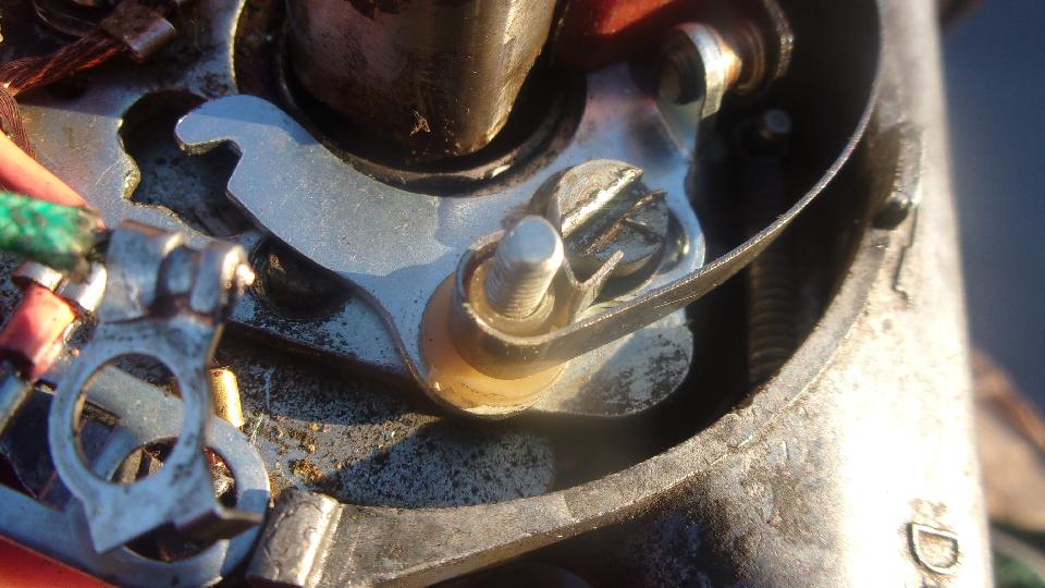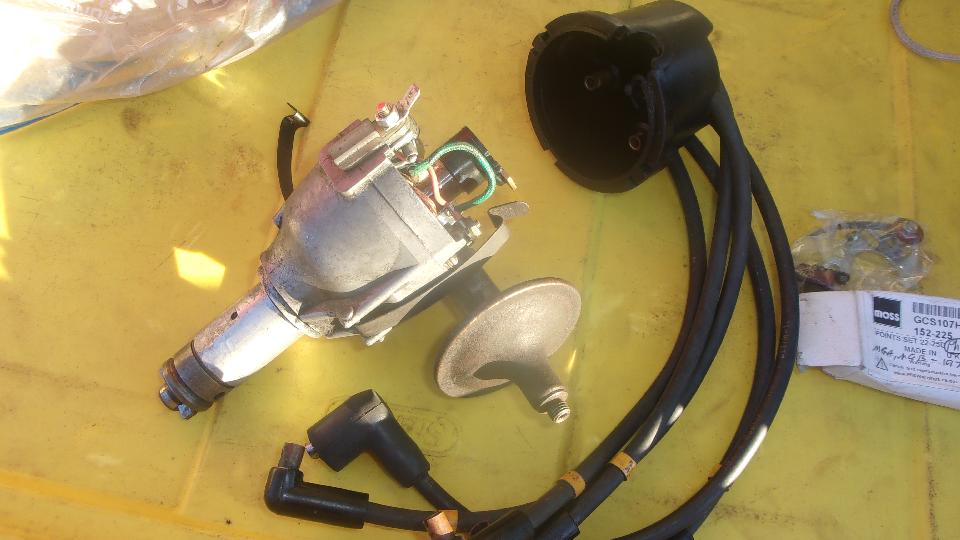 Pull out the old distributor that served faithfully for years before giving problems a few weeks ago. Look at the old points set that I was cleaning and adjusting and testing, and couldn't find anything wrong with them. Also a phenolic a rubbing block, but this one had a thin steel tube over the mounting post in the distributor, so the moving contact had a fixed pivot shaft as part of the base plate (easier to install).