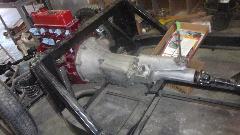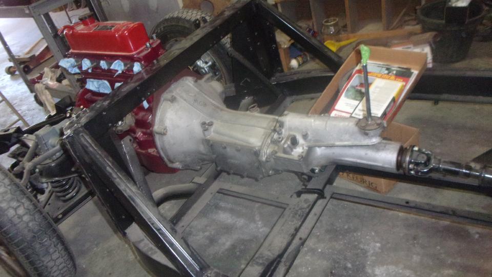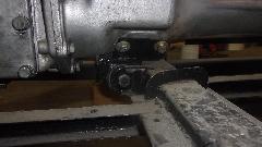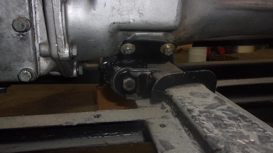 Then another short distraction, a good look at the gearbox rear mount where Stu had installed a 4-synchronizer MGB gearbox in the MGA chassis. To get the correct mounting height for the rear mount, he began by cutting the original 45-degree welded mounting ears off the frame. He relocated and welded these back in straight forward of the frame cross tube. Then parts of the original MGB U-shape bracket were welded to a new MGA rubber mount (the thick Silentbloc style rubber bushing with inner and outer steel sleeves). This positions the MGB gearbox rear mount very close above the MGA frame cross tube. We measured from bottom of the propshaft flange coupling to bottom of the frame for height reference, 3-7/8 inches.
