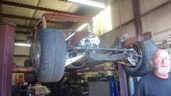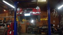 Finally a few extra hands helping to stuff the new engine into the car, mate it to the gearbox and bolt down the engine mounts.