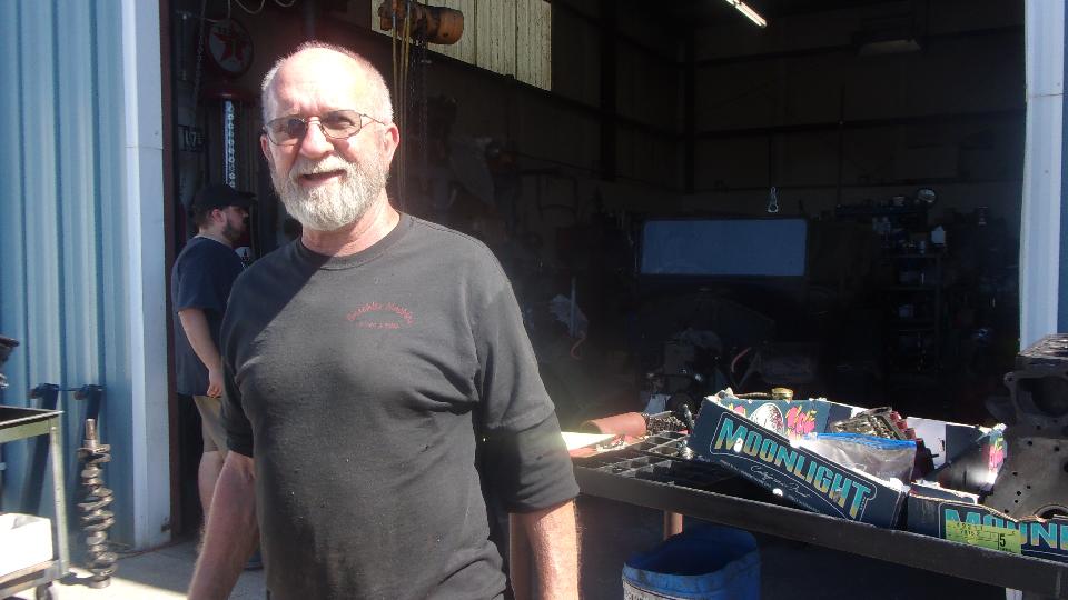 In the right bay, hey, his latest hot rod Ford project is not a flat head. He was seriously considering a vintage big block Chrysler engine, but finally decided to go modern with an LS1 Corvette engine including all the modern computer controls for max power and better fuel economy. Go Willie!