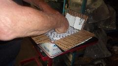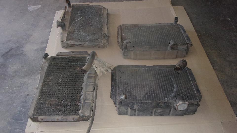 Stuart has been offering us an original MGA cell core radiator, free for the taking. But it has taken us seven years to set aside some time to take him up on the offer. The radiator at left front is from a post 1967 MGB with water inlet on the opposite top corner, but the other three are original MGA cell core radiators. We had picked up a bicycle inner tube for testing, and now was the time to get to it. Cut the skinny inner tube and stretch it over the water pipes on the radiator, close the drain valve and install a pressure cap. Apply a little air pressure, and dunk the radiator in a water basin to see if it leaks. We found two with serious leaks, but one that didn't.