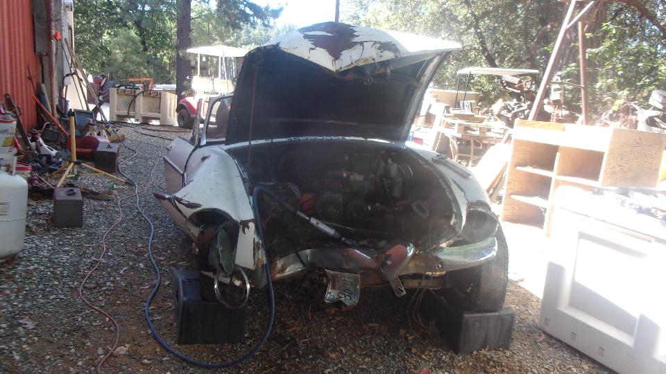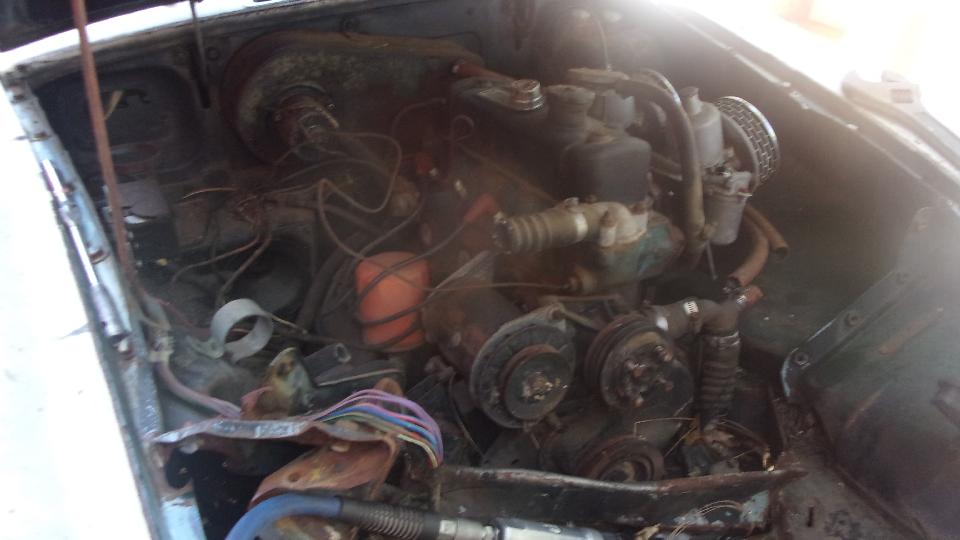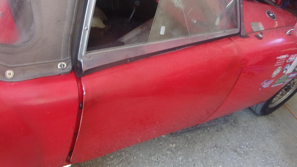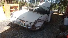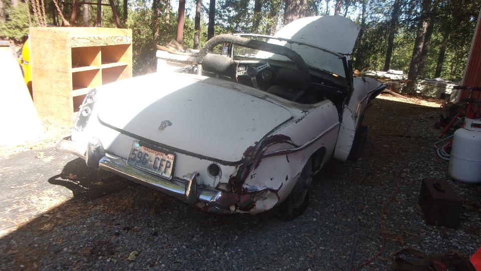 Since we were in the neighborhood, it was a good time to get back to out good friend Stuart Mast in Murphys, CA. Here we get a look at his latest acquisition, a pull-handle MGB (1962-1964). This car was in a serious accident decades back, but the owner always thought he wanted to restore it (fat chance). It was in paid storage for maybe 25 years (could have bought a new car for the storage fees). Then the storage fee payments stopped, and ultimately the car was given up for free, just get it out of here. The engine turns over with a wrench. Wanting to do a compression test, but need to pry the steering rack away from the crank pulley to do that. The car also came with a decent looking bolt-on hardtop, and another friend was dropping by to pick up the free hardtop, so I spent a little time liberating the hardtop attachment hardware from the hulk.