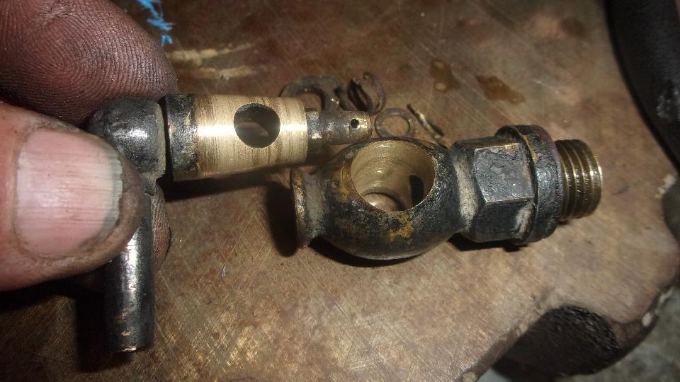 Having lucked out, it was time to do the radiator swap in my car. Navigator has been complaining for years about the awkward wing screw style drain valve in our car, and we found one original style petcock valve with one of these radiators, so it was time to change that as well. The petcock was stuck, and once we got it free to turn it was leaking some. So I took it apart for cleaning, lapped the tapered cones together with a drop of valve grinding compound, then cleaned it out and put it back together with a dab of silicone grease, and it was good to go.