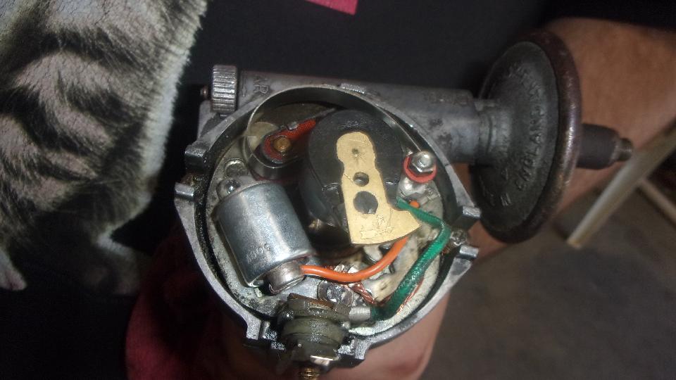 For about a week now the car has been getting progressively harder to start from cold (and it's never below 70dF morning or evening). It would crank and crank with only intermittent pop, then finally start and run fine. Late night it finally refused to fire at all, so this was going to be a good time for diagnostics and a fix. It turned out to be open circuit in the HT lead from coil to distributor cap. Original type side entry cap with screw in spikes through the wires in the cap.