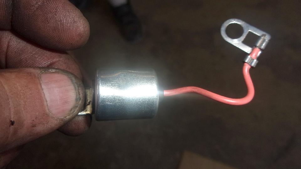 Well, maybe not. You know I said thing were not going as planned today. Before we could get to the road the ignition was crapping out with engine dying, not going anywhere, guessing a failed condenser again. Temporarily clamping up my test condenser, the engine ran well enough to drive it up the hill back to the shop. Disconnect the test condenser, and it would die. Pretty good indication of a failed condenser. It was hot today, and we were pretty pissed by this time, so sit down with a cold one while the car cools down. Then pull the distributor to change the condenser, after which it was running again. Center picture below is the failed condenser that was removed. Picture on right is the "Lucas" condenser from the Moss Motors web site, same part. My records show very recent installation, very short life, just crap parts, and multiple failures. I don't need this sort of fabricated problem with everything else going on. Avoid current issue Lucas condensers like the plague.