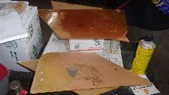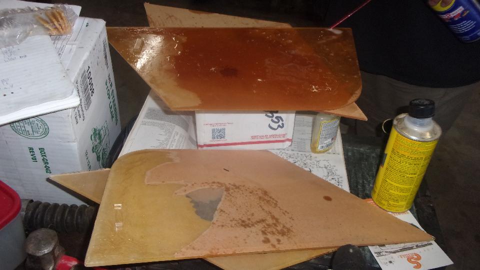 The other issue was trying to peel the protective paper off of the Perspex panels, having been drying in place for decades. Traditionally WD40 may soak off a window sticker, but not this time. We ultimately gave up and tossed the Perspex panels in a tub of water to soak. That was working, slowly. More than half of the paper finally soaked soft and came off, but more remained. So we left them soaking it the water, and installed our older scuffed up panels into the new frames on the car for now. We will come back later to see how well the "new" vintage panels will clean up.