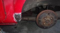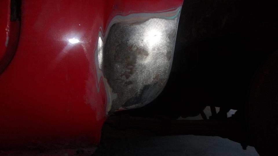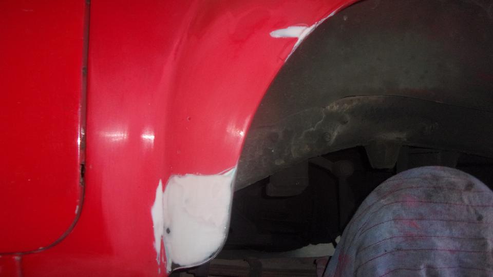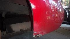 By then it was getting later than anticipated (past lunch time) before we got started on a bit of body work to repair that irritating large dent in the left side dogleg that we picked up an hour after midnight April 30th. I know I couldn't get a picture of it in the dark, but I can't believe I didn't take a picture later or even mention it after it happened. Well there it is after some hammer and dolly work to get it straightened out, and we will touch up a few more paint chips and blisters in the process.