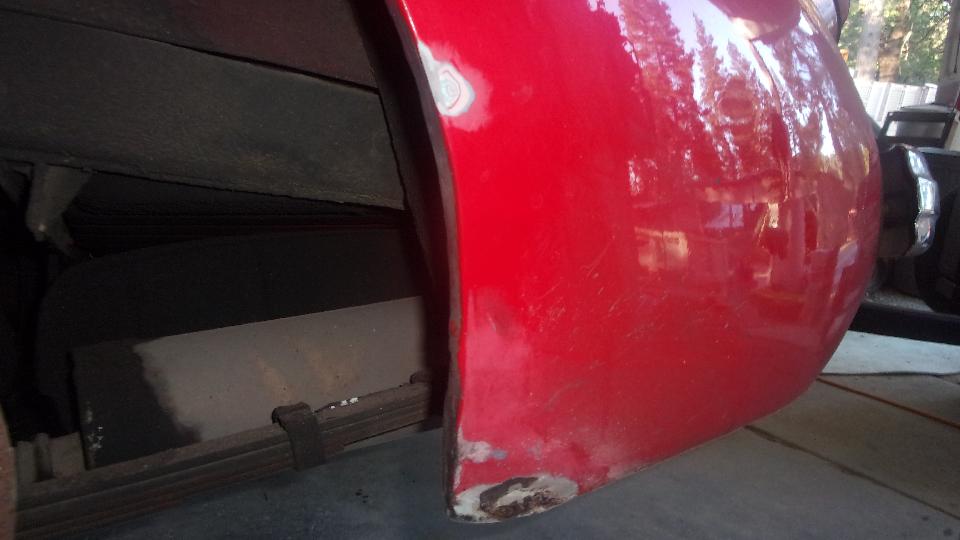 I can't believe I talked myself into this, but see the bit of primer at top of the fender? There was some rough texture paint in that area since it was touched up there a year ago in York, PA (while the front end was being repaired. So time to take advantage of the opportunity and sand it down to be repainted. So I did. 5-pm, rinsed clean, all dry and taped off long the piping line, ready to paint.