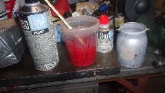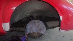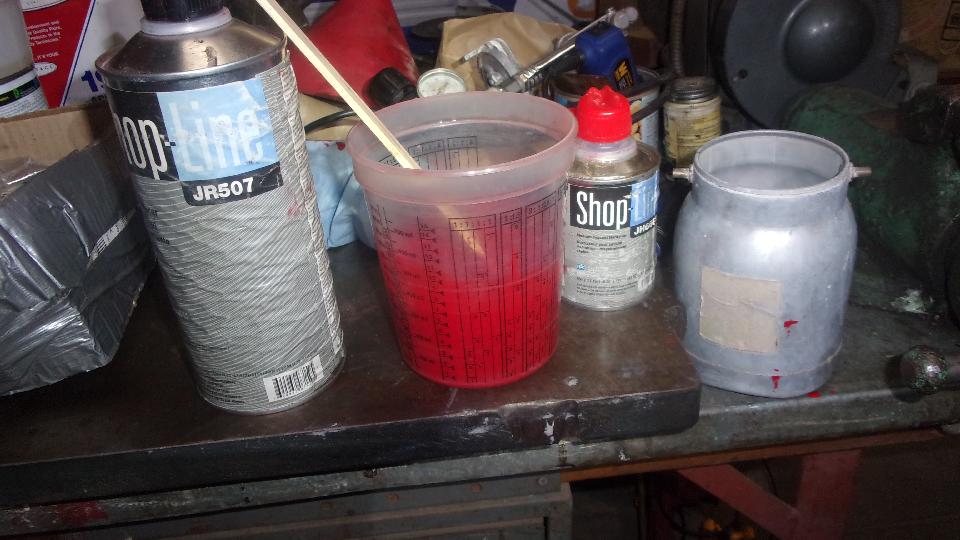 Mixing paint. In case you were wondering, this is the remains of the paint we had special matched a year ago, just been carrying it around in the trailer for the next special occasion. 5:30-pm, all one color again, get on to cleaning up the paint gun. Give it an hour, and we can put the wheel back on, drop it off the jacks, and pull off the paper and tape. Sure enough, 6:45 and there it is. Cute, huh? We ain't driving it away just yet.