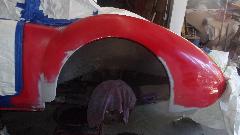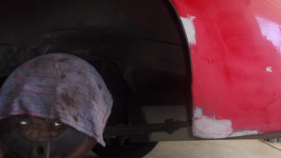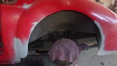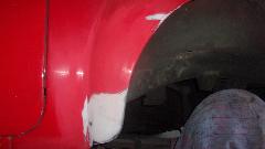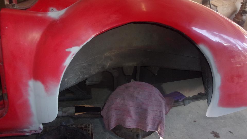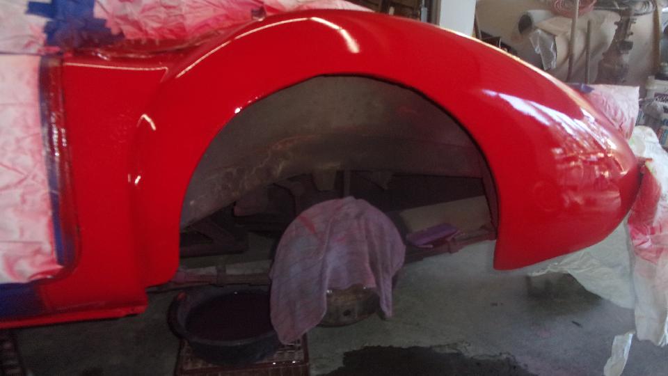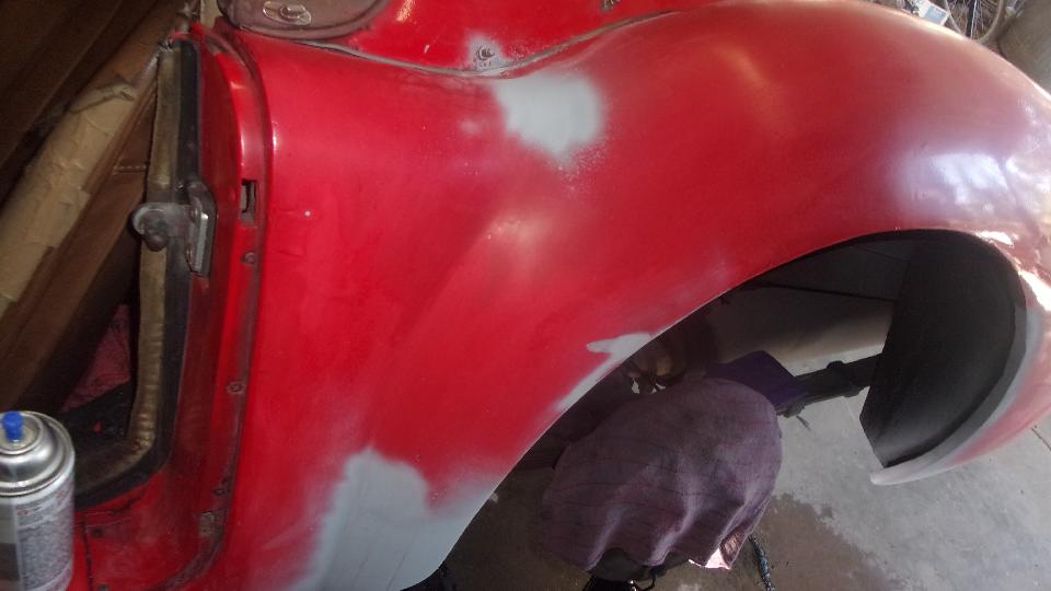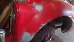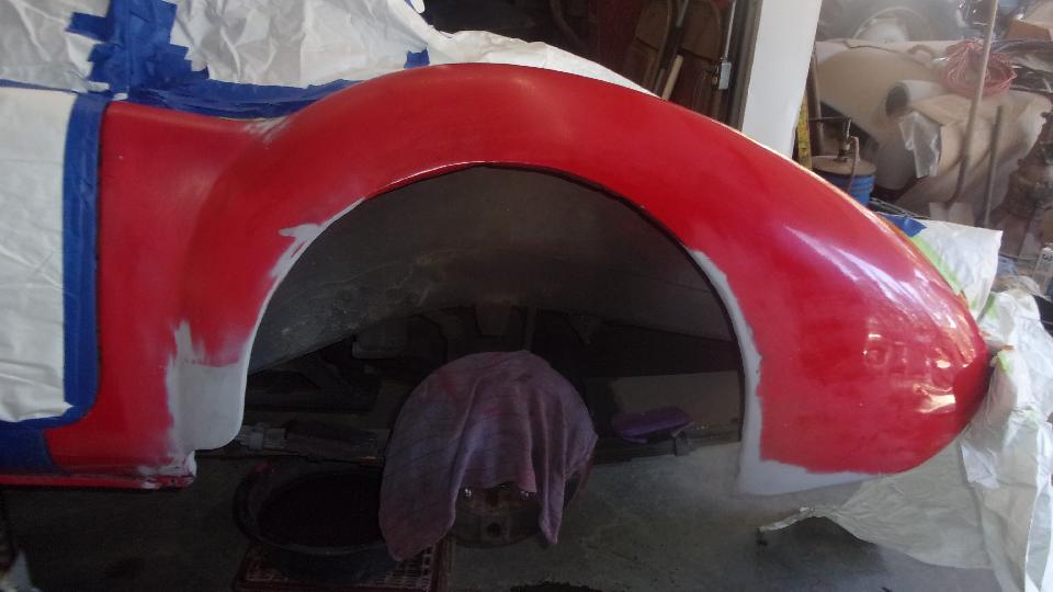 Early start. Mission for today is fender finishing and primer, and hopefully get the red paint on it before dark, which may be wishful thinking, but we'll see. Wet sand the 2nd pass filler, and looking pretty good, but needing a little touch up. Two more passes at filler and wet sanding, because it goes fairly quick. Then primer, 10 minutes between coats, 20 minutes before wet sanding, and 30 minutes before top coating. Keep the clock running.