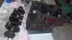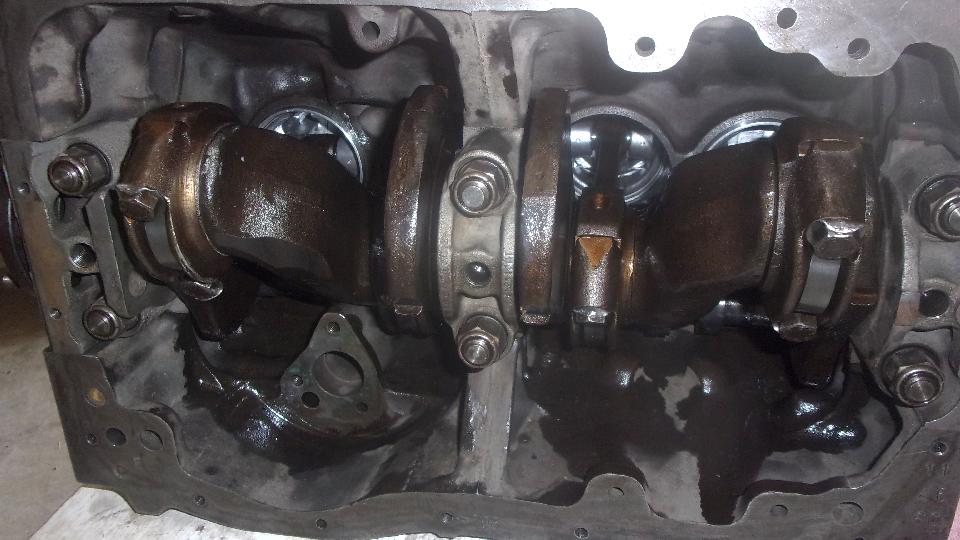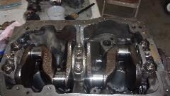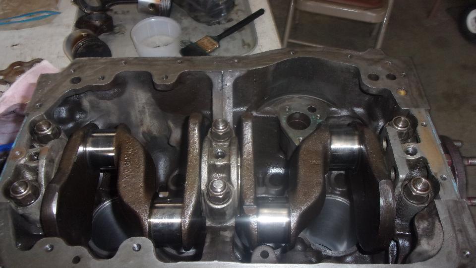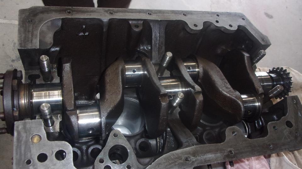 All pistons and rods installed, big ends torqued down and lock tabs turned up. No oil pump or sump yet.