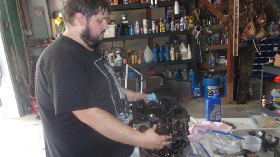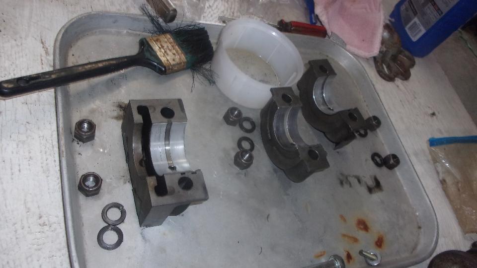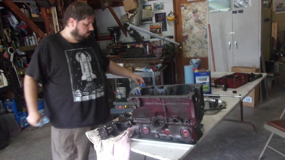 Pay the man, and then head up to friend Stuart Mast's place in Murphys, CA to get to work assembling the engine. Navigator Elliot is getting more adept with this stuff, having had his hands inside the engine a few times by now. He seems to be taking a bit more interest in in it in recent years. Clean the heck out of the block first, then set the main bearing shells in the cradle and caps and oil it up.
