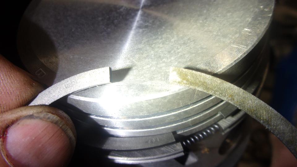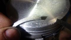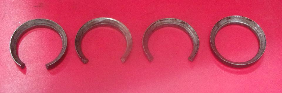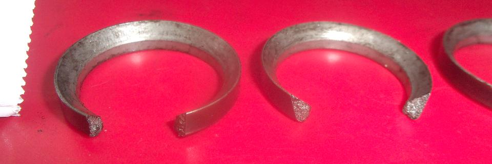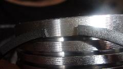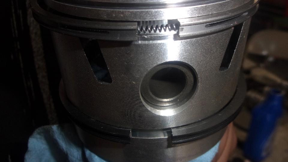 The 4th ring just above the wrist pin was a puzzler like I had never seen before. This one has a sideways "H" shape cross section with what I presume is an expander behind it. That looks like an oversize helical garter spring that will be under compression as a ring expander. Where the helical spring ends meet, half way around from the ring gap, there is a wire inside the spring like a still little cable to keep the spring ends aligned, and again symmetrical with no markings for top.