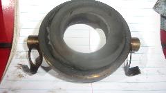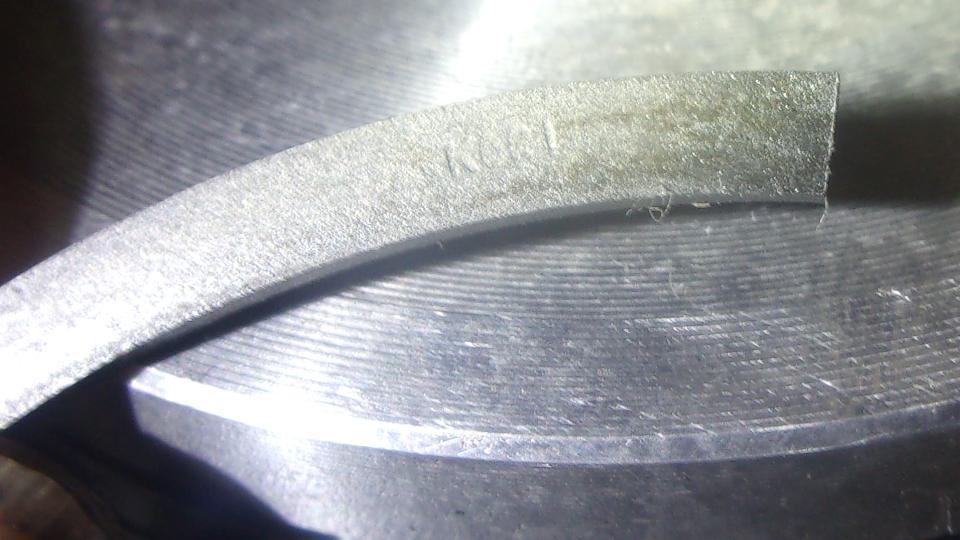 The top two compression rings are also one piece cast iron but rectangular cross section with no markings for top, so eight ring very plain. We did finally get a half decent picture of what I think is manufacturer's name logo on top of the rings just to the left side of the gap. It looks like KORI (maybe), but definitely not County.