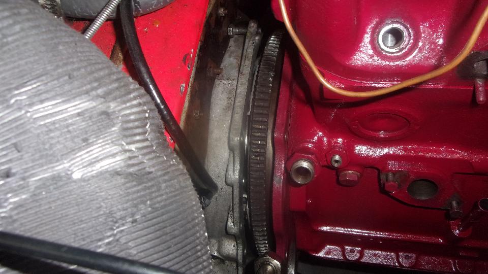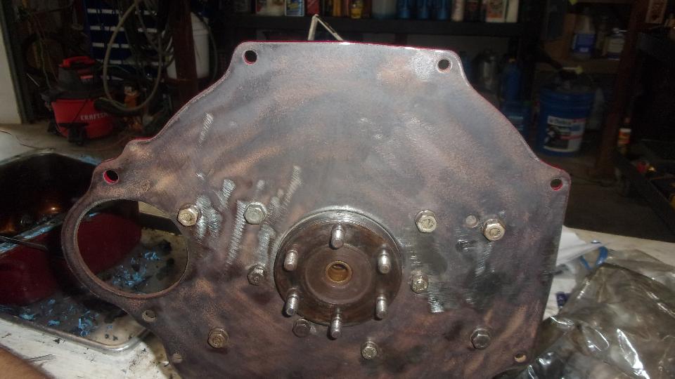 low starter position in Stu's shop, so maybe wouldn't have to remove mine from the borrowed engine when it would come out of the car. That plate had lots of surface rust, so I spent time power sanding both sides (and the edges), and got it installed with a new gasket. I thought this one was maybe thinner than the original back plate, and the bolt holes were not counterbored, so I measured it. Original plate was 0.400" thick, but this one was 0.200" thick. Scratch head. That would put the engine closer to the gearbox, likely deform engine mounts and place the engine slightly farther aft. Well. install it for now anyway.