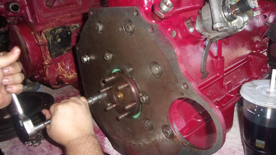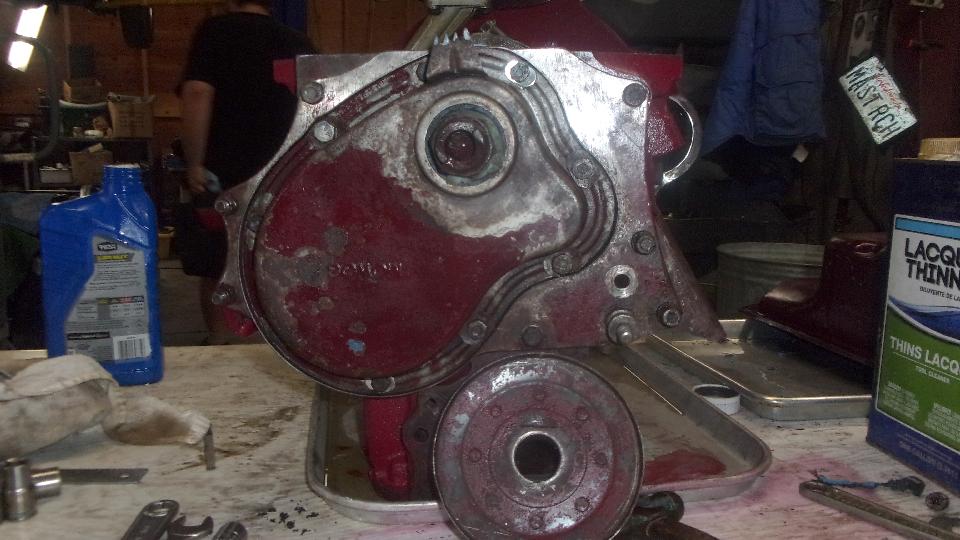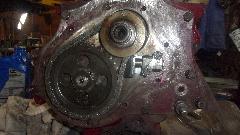 Then install engine front plate with engine mount brackets, cam front thrust plate, timing chain and sprockets and tensioner, and front cover with new seal and gasket. Install timing cover loose,