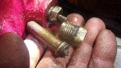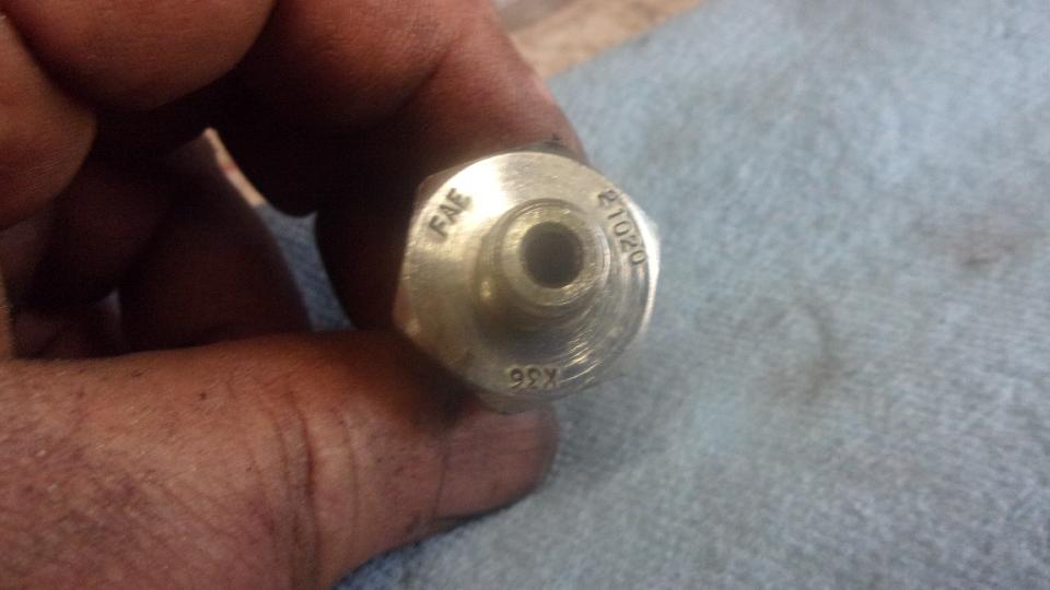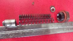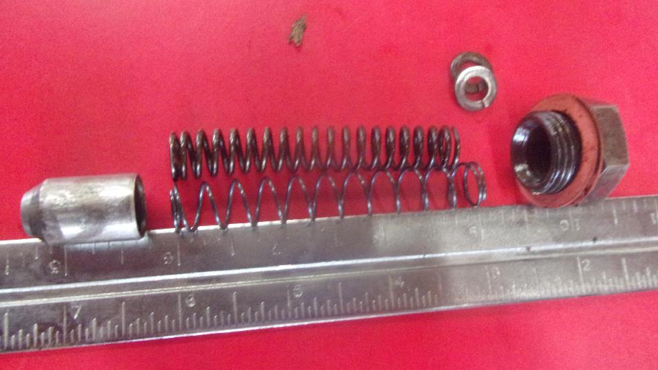 Screw in all to head studs, then go after the pressure relief valve. The old spring measured 2-3/4" long (plus two packing washers from the prior rebuild) when it should b 3". The spare spring we had in inventory was incorrect configuration with too small wire and not enough coils. Kick myself for misindexing it, as it turned out to be the spring for the hand brake thumb button. Oops. Add the correct part number to the wish list, and buy two. Then we changed two packing washers to four (two at each end) to bring it up to the correct 3" overall length. Put two fiber washers under the cap nut (as original), and good to go.