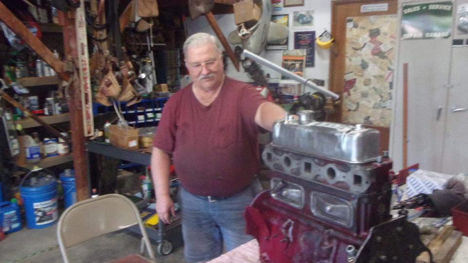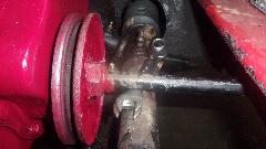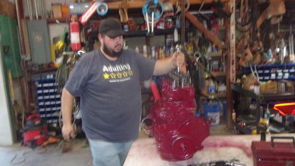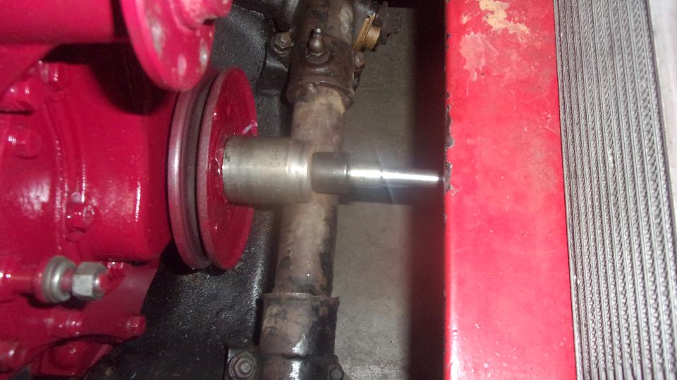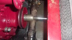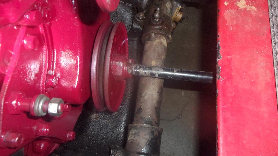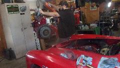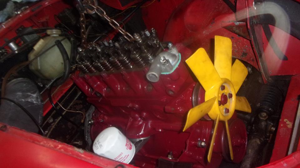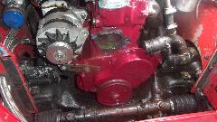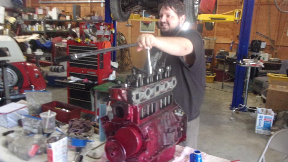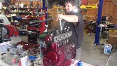 After assembling tappets, pushrods, head gasket, cylinder head and rocker shaft assembly, navigator Elliot is doing his thing with the torque wrench. Our friend (and shop host) Stuart Mast insists there should be a picture of me somewhere, as I was installing the final covers and what we thought might be a good used water pump off the shelf (because navigator couldn't find the spare one in the trailer).