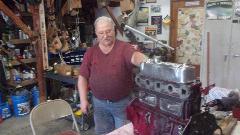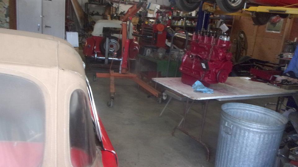 Scheduled day to at least begin doing the engine swap to remove the loaner engine and reinstall my original engine (now rebuilt). We have a pair of engine mount spacer plates recently arrived which are intended to raise the engine enough to make the hand crank fit to work again, but these will be set aside until it's time to set the new engine in the car. We have the freshly rebuilt engine, sitting on the table, and the now cooled down car getting fluids drained and engine disconnected for removal.