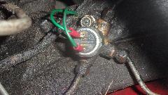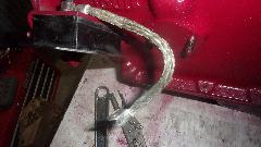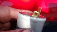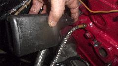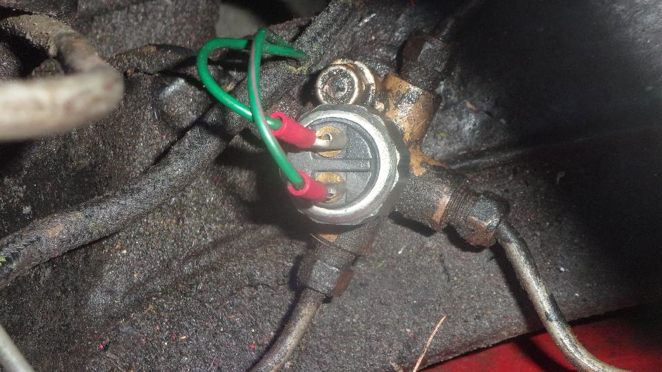 Before we put the bonnet on there are a few electrical repairs to attend to. First for the failed brake switch, easy. Pull two wires, un-screw the old one, screw in the new one (already prep'd with Teflon tape on the pipe threads), and plug the wires back on. Yup, the brake lights work.
