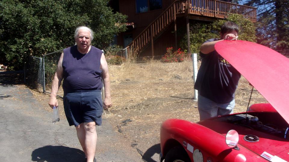 Got to Basil's place okay, still running cool. Picked up the MGB exhaust valves, had a 25 minute chat and rest, then headed back. 90 miles to Lodi in an hour and a half (no delays), then refuel again, and keep going another 75 miles or so through the valley and up the big hill to Murphys, CA. Yeah, this was supposed to be our heat day off, but needing to get the head off, replace the exhaust valves and get it back together today, so we could get on with the engine swap as scheduled tomorrow. Did I say it was hot? 102dF on the mountain, stay out of the sun and drink a lot.