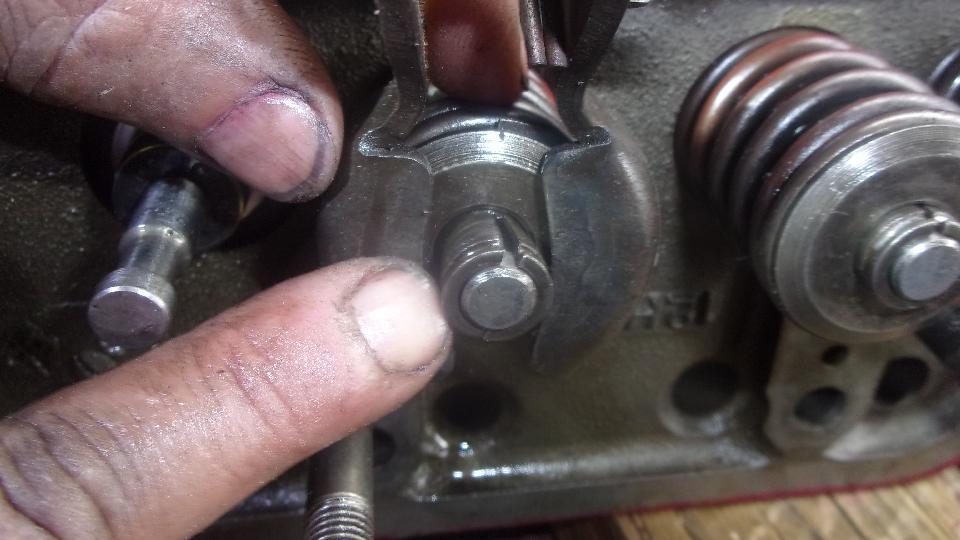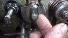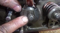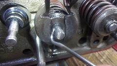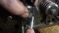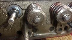 Install the dual springs with spring cap, and push them down with a spring compressor tool. Then install the original style seal O=rings, which fit at the bottom of the groove in the valve stem. Then install the valve cotters (split locks) which will sit on top of the O-ring. The rubber ring serves to prevent oil from running down the valve stem through the gaps in the cotters.