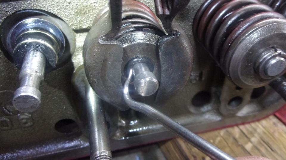 With the twin cotters in place, release the spring compressor (carefully) to lock it all together, and install the hair pin clips (just to be original, I suppose). Later production engines with type-B valve grooves and cotters do not use the clips.