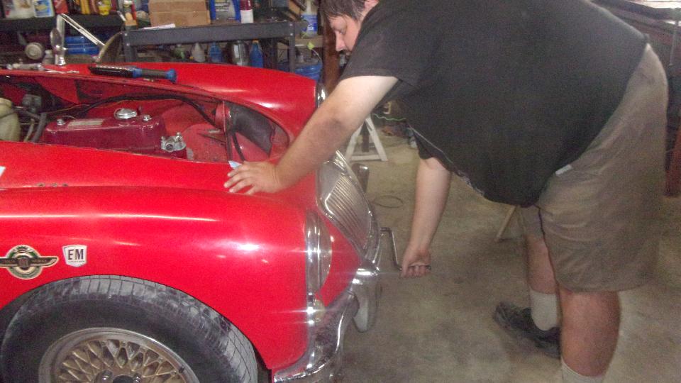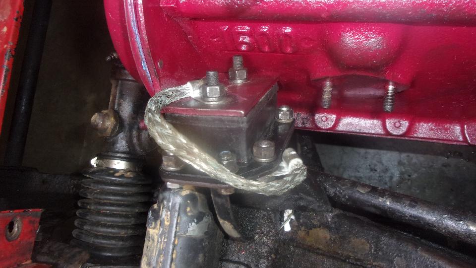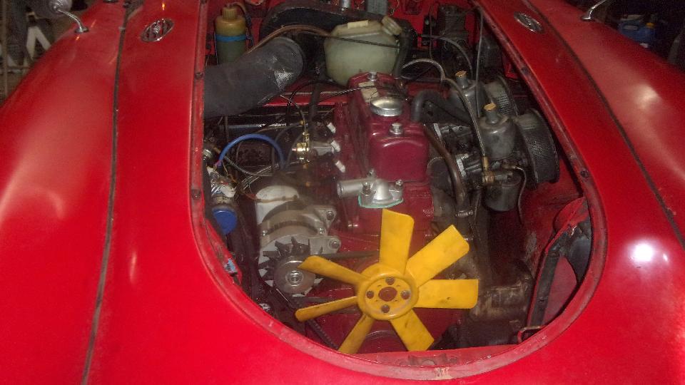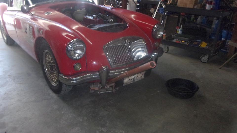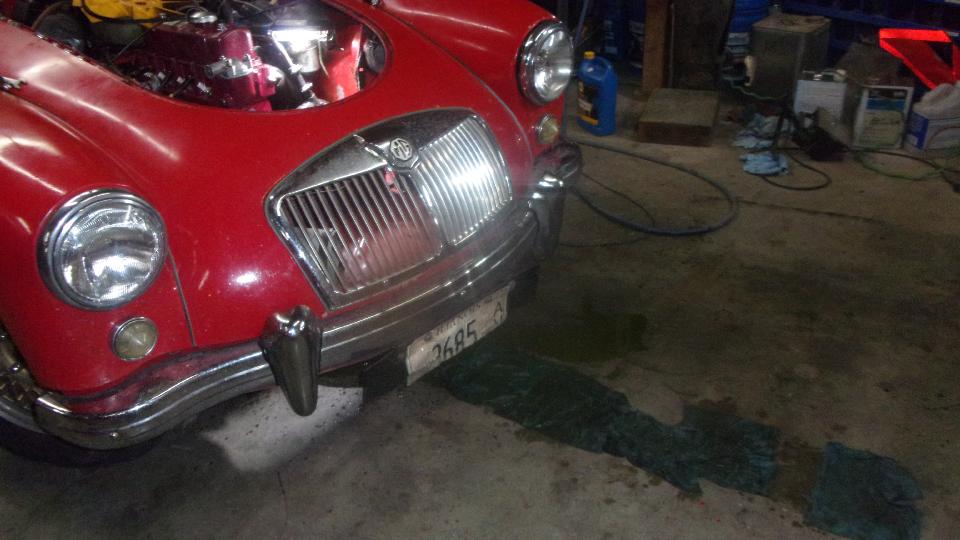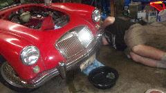 Here's a good chuckle. Stuart was picking through parts for his MGA restoration project when he picked up this heater air inlet duct stuffed up with a mouse nest. Got the engine fully dressed just before installing the radiator, then while re-checking everything noticed the fast idle link was missing. Dang those little push nuts hard to install, impossible to remove without breaking but easy to fall off when you're not looking. Had to R&R the front carburetor again to install a new link with the tiny push washer clips. Then radiator in with hoses all tight, filling with coolant just before start up, and coolant was running out on the floor. Oops. The free-spinning used water pump we picked off the shelf had a leaky seal, so pull the radiator out again and mop up all that antifreeze.