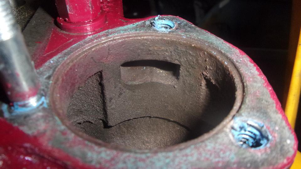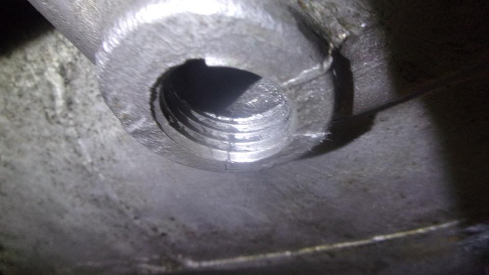I filed off that little sharp point at the beginning lead-in of the thread. On a chance that it might do some good (or maybe not), I applied a few drops of Krazy Glue up top and down the face of the threads, hoping it might wick into the cracks. Then I mixed up some JB Kwik Weld (which is excellent stuff for patching a fuel tank), scooped some up with my pinky finger to load it up inside at top of the thread. Then walk a circle while spreading the stuff along the gearbox sump floor around the drain port. Mix up more JB stuff and smear it on the bottom around the port to cover and seal the cracks from underneath. After each step of the process, run a 1/2"-NPT tapered thread tap into the port to assure the threads will remain clean. Then we gave it a half hour to set up.