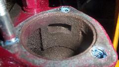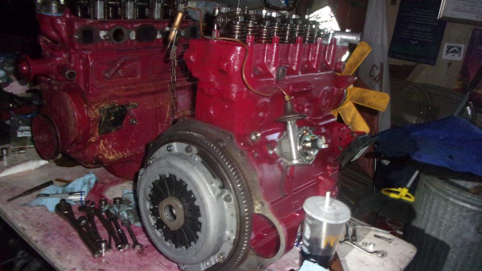 Then it is out, and there are two engines sitting on the table, the rebuilt one in front and the extracted loaner engine behind it with clutch already removed. Not long to remove flywheel and rear plate, get a new gasket and have the rear plate snugged up on the new engine. There is only half enough light in this shop to begin with, but this is about the time the power went of leaving us in a darker shop without the swamp cooler, one large garage door open, and working with two small flash lights when needed (which was fairly often). My favorite $30 camping flashlight is a Halogen lamp, lots of light but it eats a pair of AA batteries in an hour of continuous use. We have gone through two dozen batteries in the past few working days, and now running out of batteries (can't afford to feed the thing). And yes it is 95dF with limited breeze, but we are still in the shade.