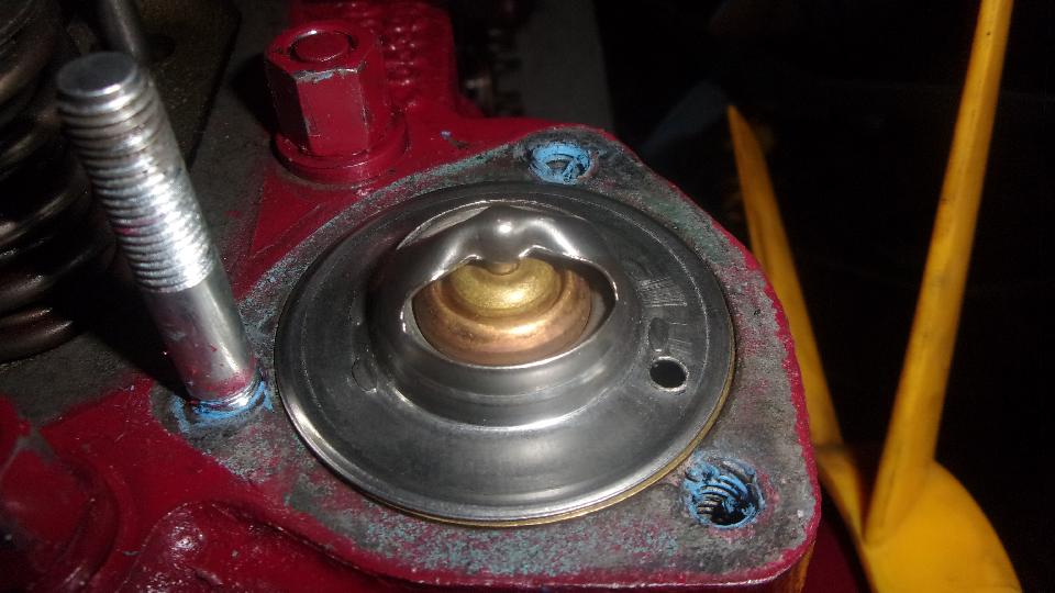 Time to R&R the new thermostat we just installed yesterday, because I found the spare blanking sleeve in the trailer and want to install it. Quick removal with one nut coming off and two studs coming out, which is okay because I finally have proper thread sealant to use (rather then the blue stuff RTV). Drop in the blanking sleeve and the thermostat (with the desired breather hole drilled in the skirt). Install the three studs, and a new Klingersil gasket, slap the cover on, tighten the nuts, and promptly strip the threads (again) on one stud while using a standard 6-incb hand wrench.
