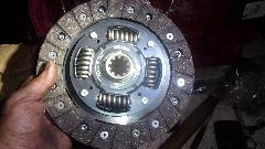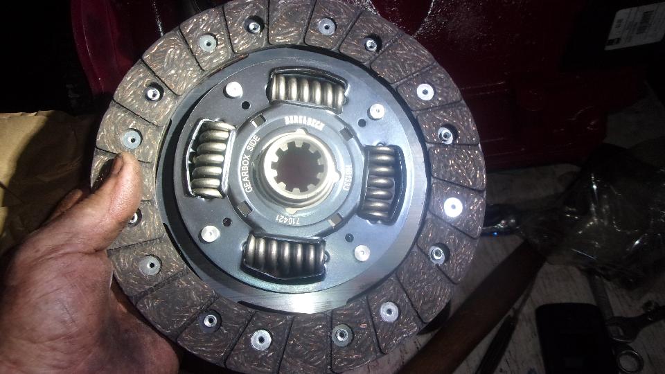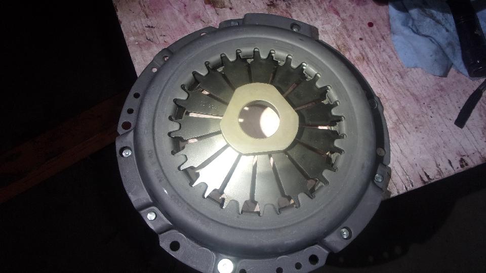 Unpack the new MGB clutch disc and pressure plate assembly. Good quality bits here. Semi-metallic clutch disc from Borg&Beck, very nice. The last one has run 4 years 95,000 miles and still plenty of life left. Only changing it because it is convenient now, and it may have the opportunity to run that much farther without removing the engine or gearbox again. The pressure plate is AP brand, made in Italy this time. The last one ran that far as well, but I think nearing end of life when the center release thrust pad securing grommet is loose in the spring fingers (common issue with the diaphragm type clutch). Not long to get those bolted up.